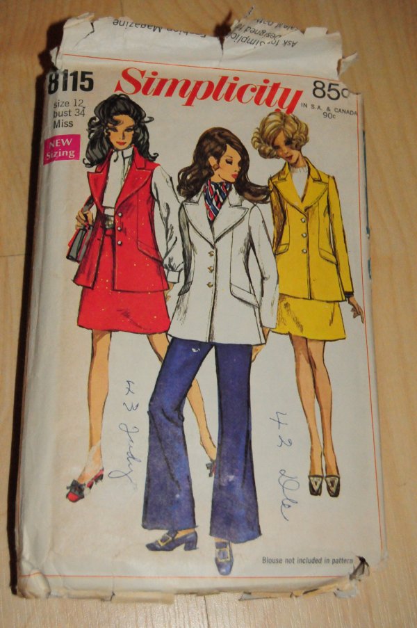 I have been advised to just throw myself into the garment-sewing thing, and learn by trial and error. I am not getting on very well with the idea of making underwear which I won't wear and which I couldn't squeeze myself into anyway (a lot of the vintage patterns available are tiny sizes), so I decided to look for patterns for clothing which I would like to wear.Love the yellow suit (first pic)! It is a few sizes too small though, so I shall have to figure out how to upsize it. The second pattern is for a basic A-line dress, which I like. Not sure about the fitting at the waist - having no discernable waistline myself, I tend to look a little porky if I wear a belted style like that. Love the pussybow blouse in the third pic. With the fourth pattern, I guess there's nothing I really love about it - it's just that they're wide-legged styles, and its a Vogue pattern, which I am told are the best in terms of instructions.